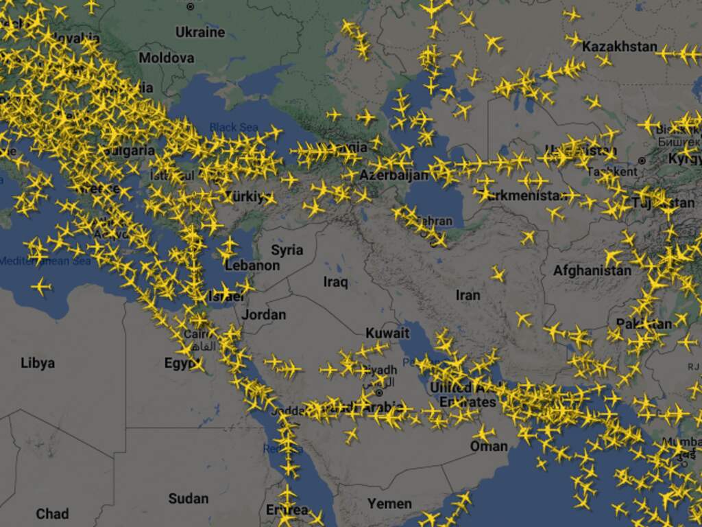 Te zien is dat vliegtuigen het luchtruim rondom Israël en Iran vermijden. Meerdere landen in de regio hebben het lichtruim gesloten vanwege de Iraanse aanval.