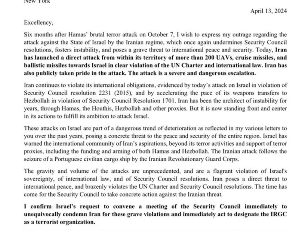 Iran neemt het de VN kwalijk dat het de dodelijke aanval op het Iraanse consulaat in Syrië op 1 april niet expliciet heeft veroordeeld. Ook wijst het op artikel 51 van het VN Handvest: het recht van een land om zichzelf te verdedigen. Iran zal dat blijven doen, benadrukt het.