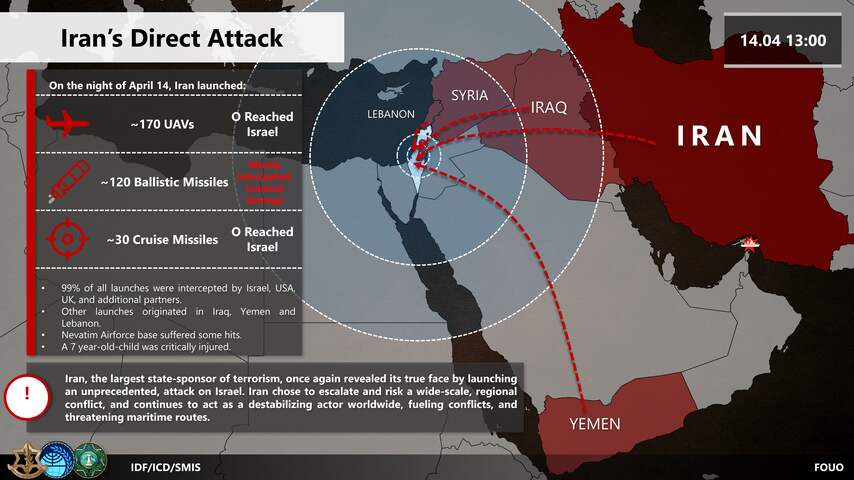 Het Israëlische leger heeft zondagochtend vroeg laten weten dat in totaal meer dan 300 projectielen (drones en raketten) door Iran zijn afgevuurd op Israël. 99 procent daarvan zou onderschept zijn. Eerder zei Israël nog dat het om 200 drones en raketten ging.