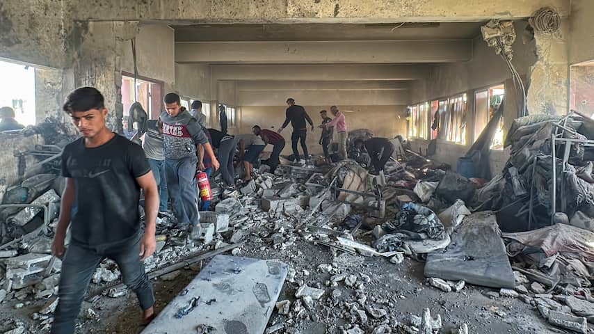 In het voormalige schoolgebouw in Nuseirat wordt gezocht naar overlevenden.