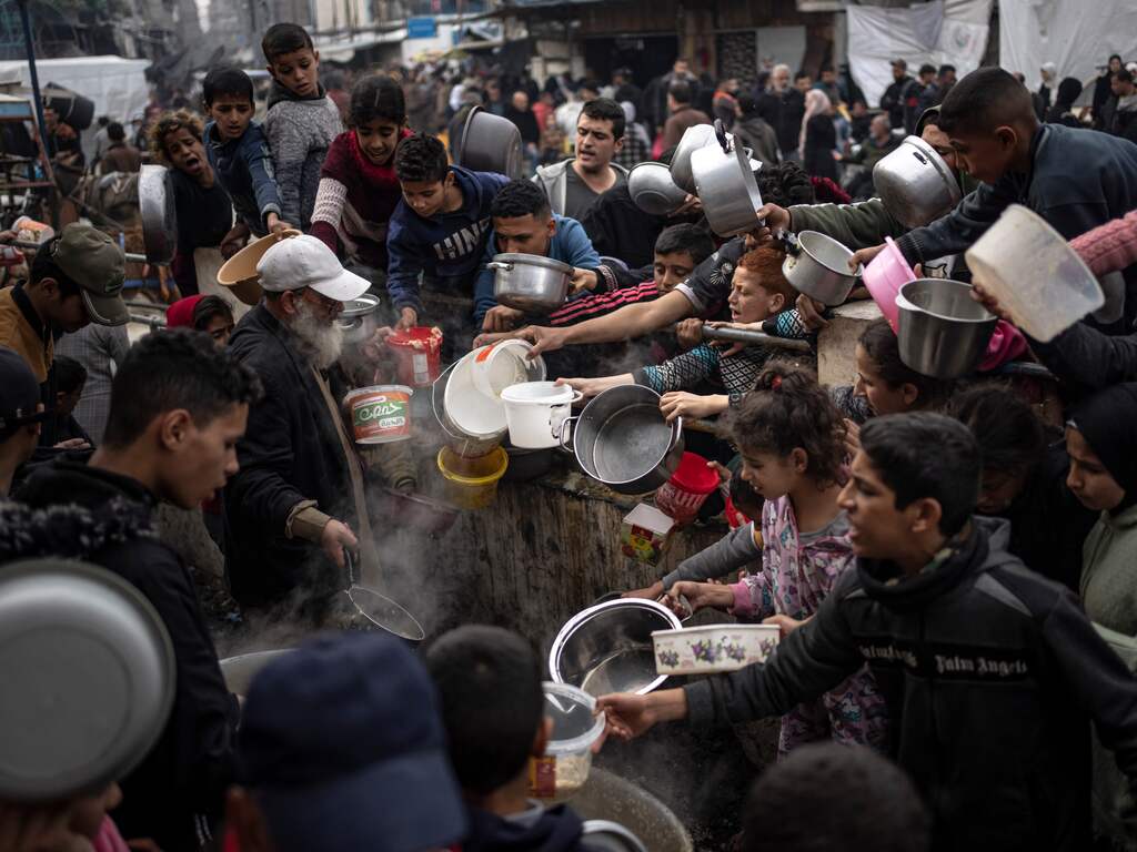 De humanitaire situatie is volgens hulporganisaties al "mensonterend". Velen leven op minder dan één maaltijd per dag. Op onderstaande foto dringen Palestijnse burgers om iets te krijgen van het weinige voedsel dat hulporganisaties kunnen bieden. | Beeld: APVerbieden van humanitaire hulp 'totaal ongegrond'