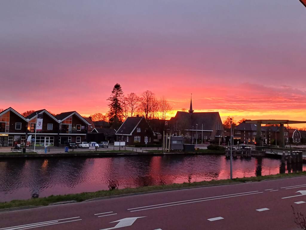 In Nagele (Flevoland) was de lucht feloranje. Er zit momenteel Saharastof in de lucht. Dat zorgt voor extra verstrooiing van blauw licht, waardoor vooral rode en oranje kleuren zichtbaar blijven. | Beeld: Bert Smit