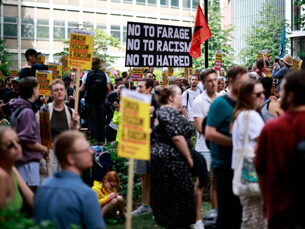 Door onze nieuwsredactie10 aug 2024 om 20:06In veel steden in het Verenigd Koninkrijk zijn zaterdag demonstraties geweest tegen racisme en extreemrechts geweld. Ook in Londen bij het kantoor van Reform UK, de anti-immigratiepartij van Nigel Farage, demonstreerden honderden betogers, meldt Sky News.