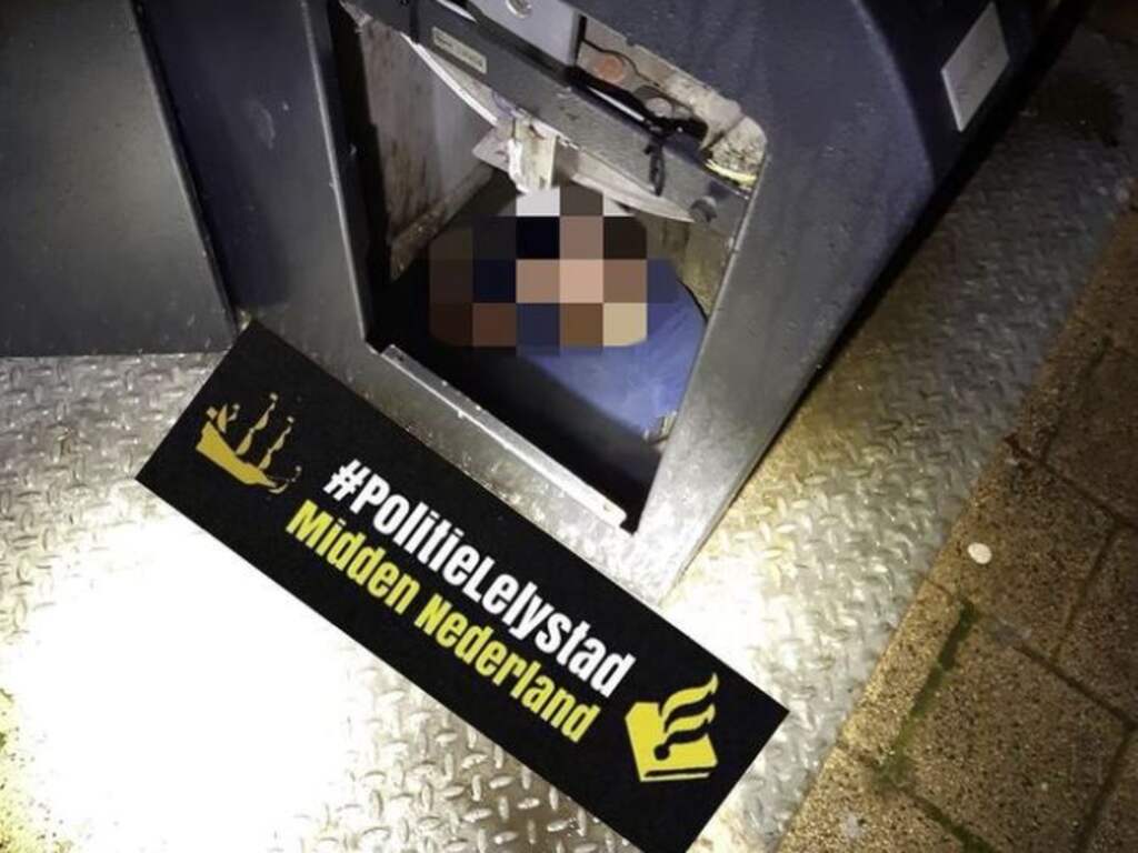 De politie dacht eerst aan een grap. "We zijn toch maar even gaan kijken", aldus de politie van Lelystad op Instagram. "Met wat hulp is de man in goede gezondheid uit de container gekomen."
