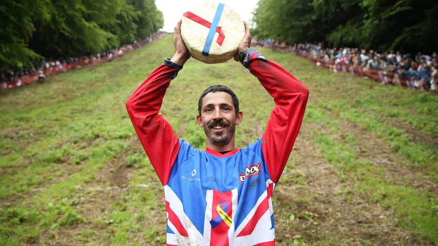 Chris Anderson mocht voor de 23e keer een kaas mee naar huis nemen na een door hem gewonnen race kaasrollen. | Beeld: Getty Images