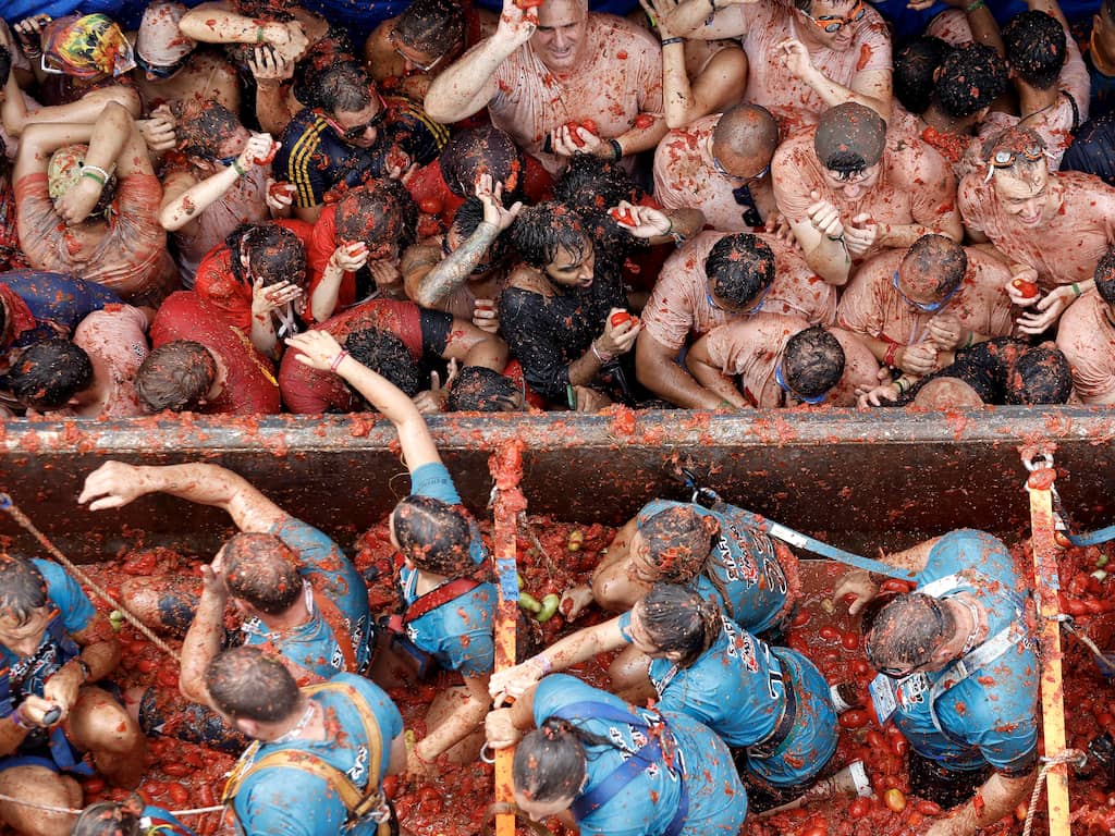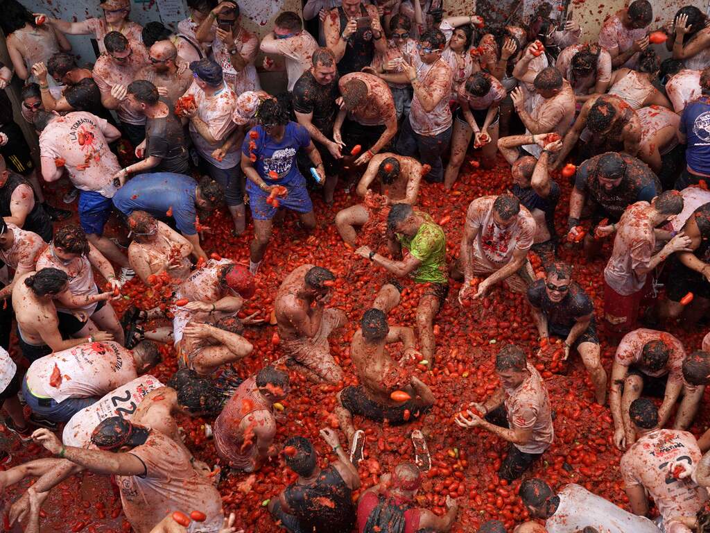 In het Spaanse stadje Buñol werd woensdag gevochten. Niet met vuisten of wapens, maar met tomaten. Dat gebeurt jaarlijks tijdens La Tomatina. Ook nu kwamen weer duizenden mensen van over de wereld op het jaarlijkse evenement af.