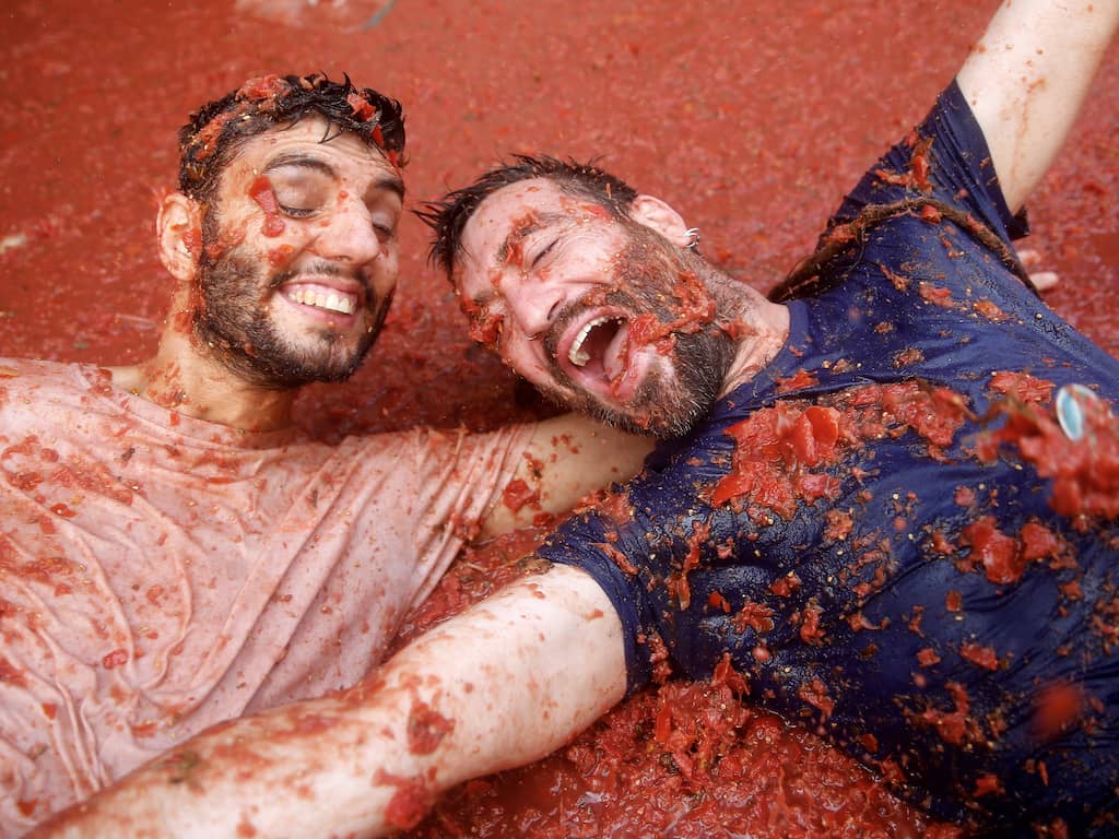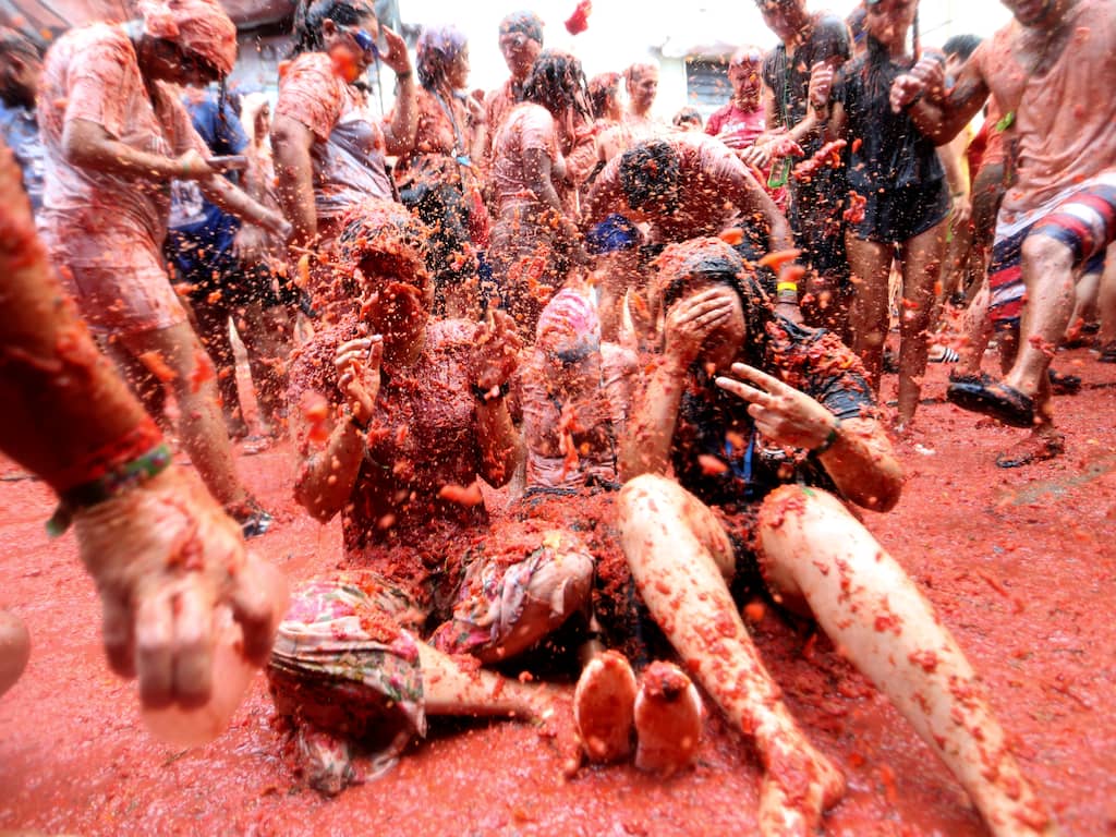 De traditie begon in de jaren veertig, toen een ruzie uitmondde in het over en weer gooien van tomaten. Een jaar later begonnen jongeren dit na te doen. Sindsdien keerde het jaarlijks terug. | Beeld: EPA