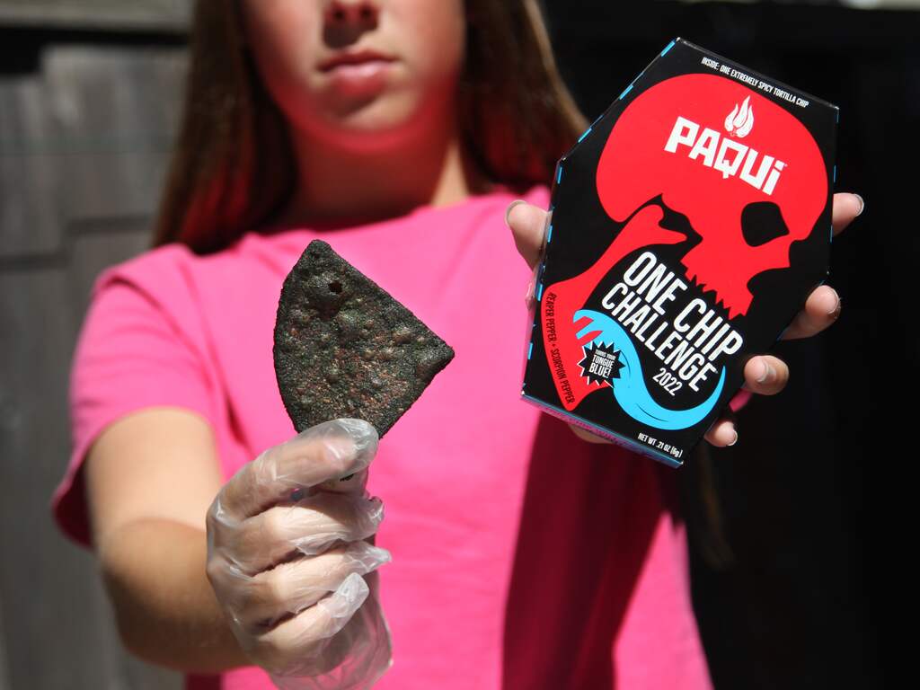 Het gaat om de zogeheten One Chip Challenge van tortillachipsmaker Paqui. Dat is één verpakt chipje, dat gemaakt is van de zeer hete pepers Carolina Reaper en Naga Viper. Op de verpakking spoort de fabrikant consumenten aan hun reactie na het eten van het chipje op sociale media te delen.