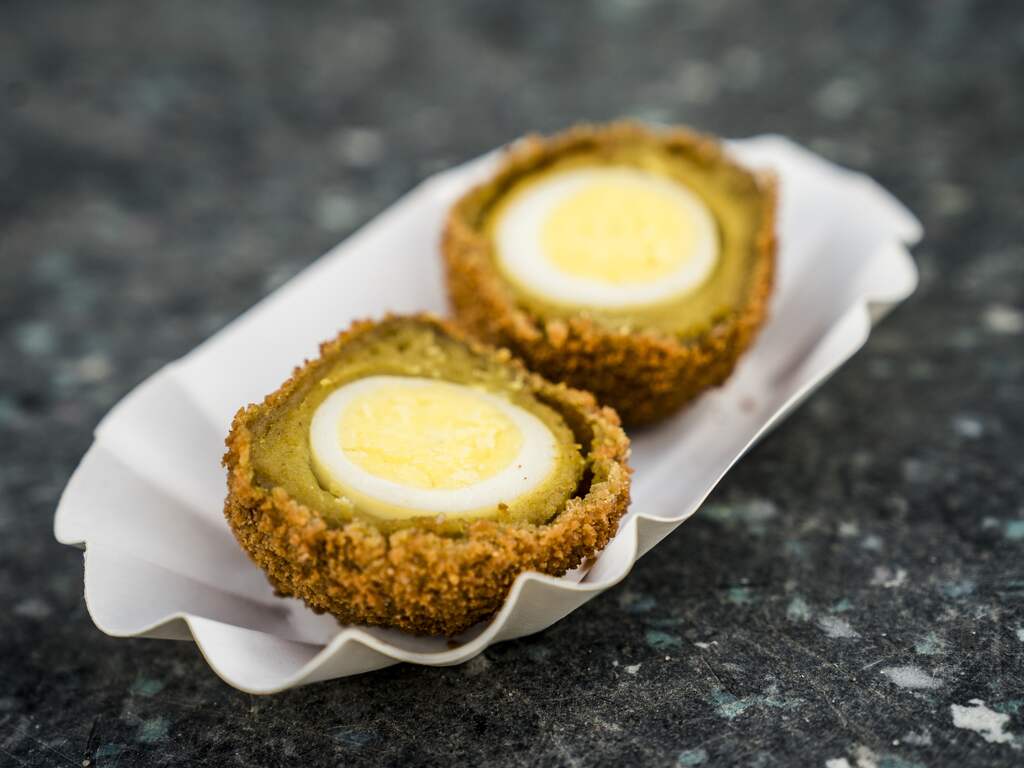 Een eierbal bestaat uit een hardgekookt ei omhuld door ragout en paneermeel. Daardoor is de snack maar beperkt houdbaar.