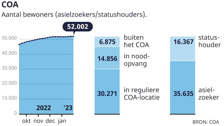 Daarnaast verblijven er in de gemeentelijke opvang nog bijna vijfduizend vluchtelingen uit Oekraïne, die niet de Oekraïense nationaliteit hebben. Zij moeten vanaf maart ook asiel aanvragen als ze in Nederland willen blijven. En dus bij het COA aankloppen voor onderdak.