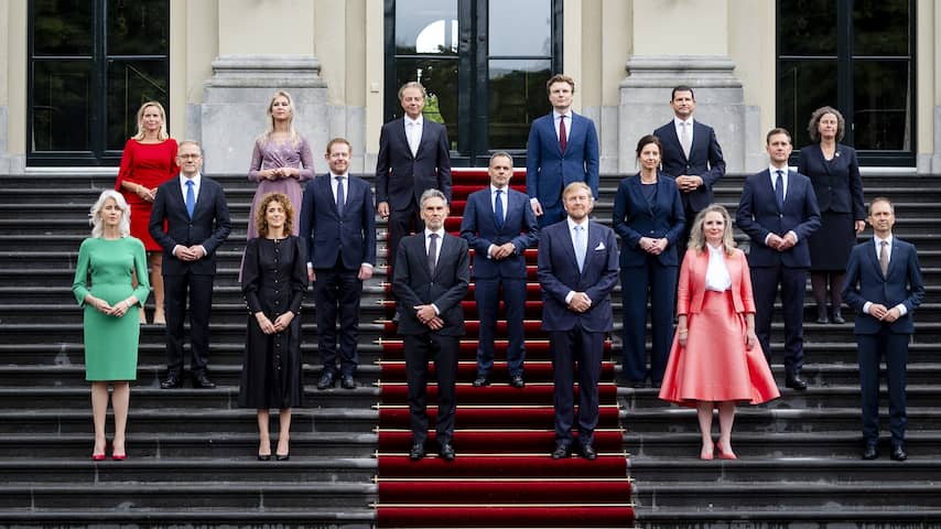 2 juli 2024 - Bordesfoto van het kabinet-Schoof, dat bestaat uit PVV, VVD, NSC en BBB. De partijloze Dick Schoof wordt premier, omdat de coalitieleiders hebben afgesproken dat ze alle vier in de Tweede Kamer blijven. Alleen onder die voorwaarde willen VVD en NSC regeren met de PVV van Geert Wilders. | Beeld: ANP