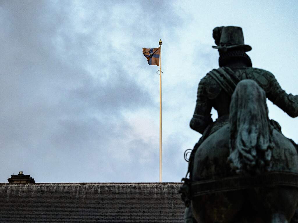 De straten bij Paleis Noordeinde worden nog schoongeboend en de Vaandel voor de viering van het begin van het politieke jaar hangt.