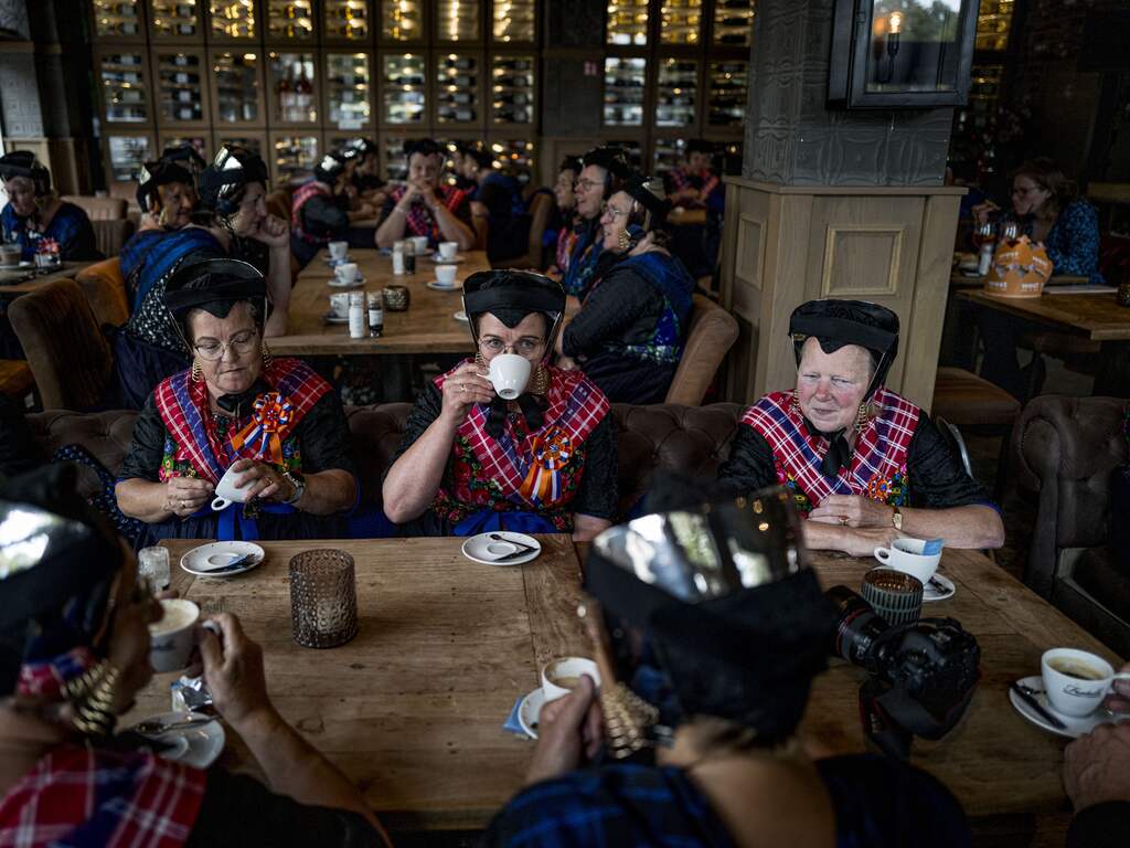Staphorsters in klederdracht aan de koffie na de koninklijke stoet in Den Haag.