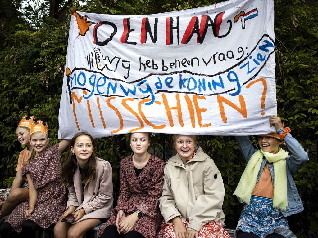 Kinderen zitten bij Paleis Noordeinde klaar voor de komst van de koning. Ze hopen een glimp van hem op te vangen als hij voorbijrijdt in de Glazen Koets.