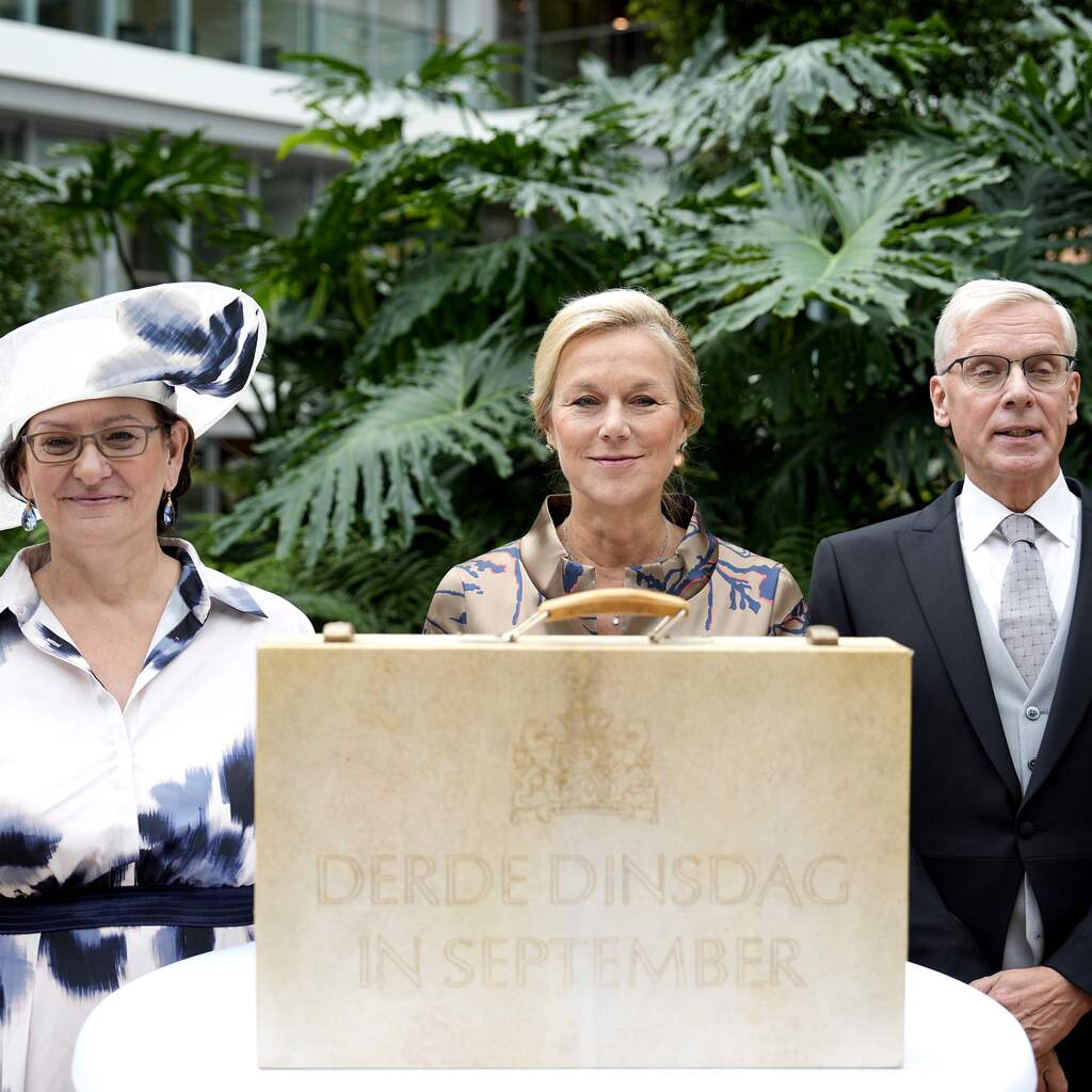 Kamervoorzitter Vera Bergkamp neemt de miljoenennota in ontvangst. Bergkamp keert na de verkiezingen in november niet terug als Kamerlid.