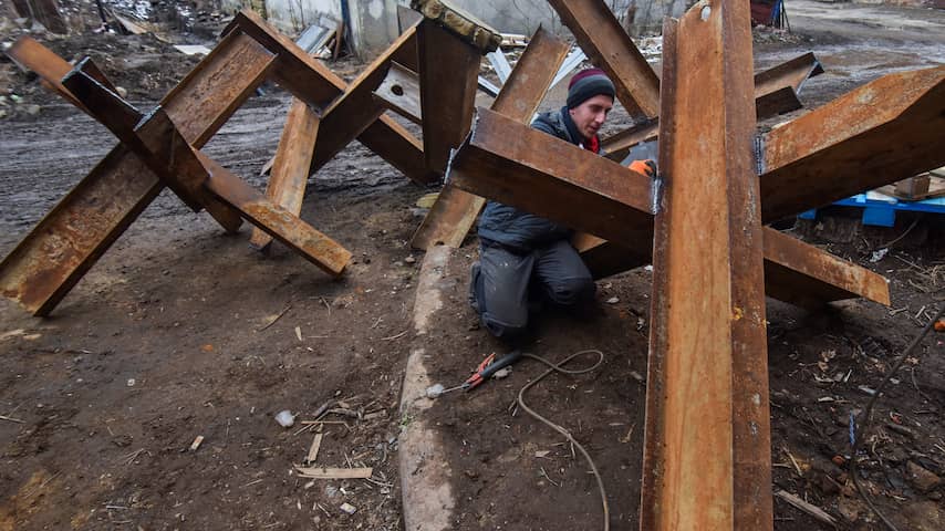 Een inwoner van Lviv last antitankkruizen. | Beeld: ReutersIn Lviv komen vluchtelingen uit het hele land samen