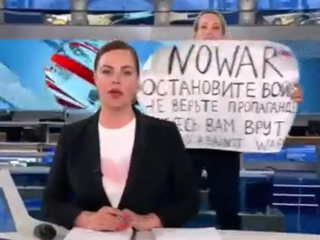 De vrouw rende het beeld in met een papier met daarop de oproep aan kijkers om de oorlog te stoppen en de "propaganda niet te geloven". De boodschap stond er zowel in het Russisch als in het Engels op.