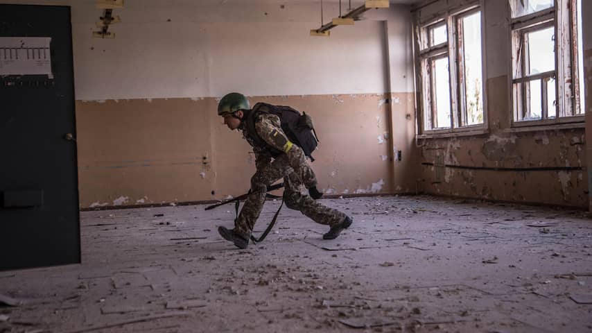 Een Oekraïense militair rent door een gebouw in Severodonetsk. | Beeld: APOekraïne zou 100 tot 200 militairen per dag verliezen