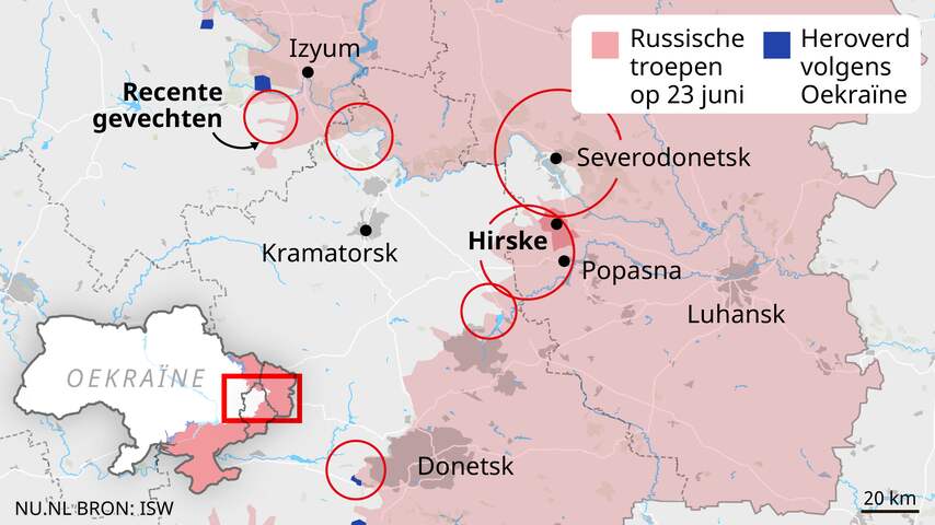 Eén keer per dag geeft NU.nl je een overzicht van de situatie in Oekraïne. Met dit keer: de zwaarbevochten Oekraïense stad Severodonetsk komt steeds dichter bij het punt van vallen. Russische legereenheden hebben het Oekraïense district Hirske in handen gekregen, dat op steenworp afstand van de strategische stad ligt. Verder wil de Britse premier Boris Johnson Oekraïne helpen bij het ontmijnen van de zuidelijke kust van het land.