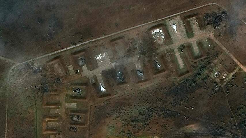 Bij de explosies van vorige week raakten zeker acht Russische gevechtsvliegtuigen beschadigd. Satellietbeelden tonen aan dat het zeer waarschijnlijk om een raketaanval ging.