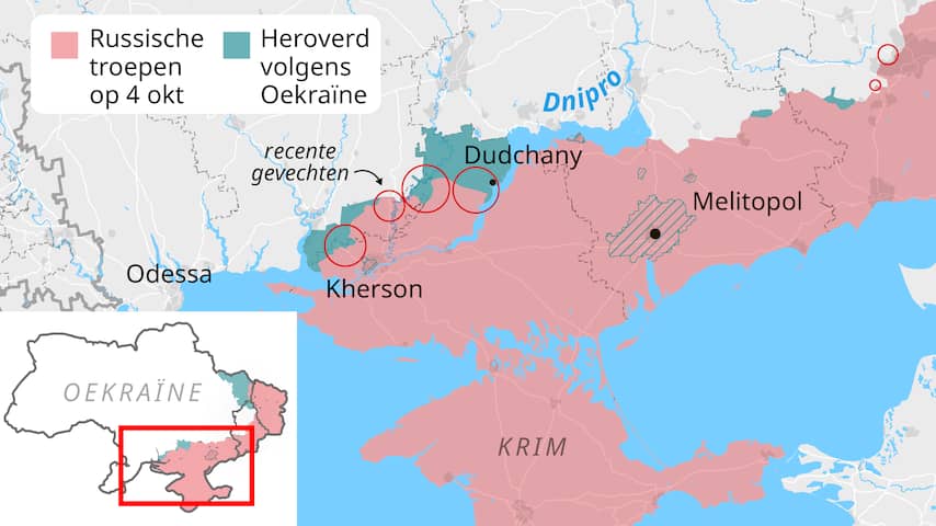 De opmars van het Oekraïense leger begon een kleine maand geleden in het oosten. Daar heroverde Oekraïne razendsnel gebieden waar de Russen soms zelfs maandenlang voor moesten vechten. Ook in het zuiden gaat het snel. Zo heroverden de Oekraïense strijdkrachten in de nacht van maandag op dinsdag de stad Dudchany. Een dag eerder bevonden ze zich nog 30 kilometer noordelijker.