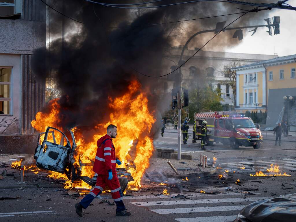 Russische raketaanvallen op Oekraïens grondgebied op 10 oktober.De beschietingen van maandag vielen samen met de ochtendspits. Ze waren onder meer gericht op een van de drukste verkeersknooppunten van Kyiv. Meerdere voertuigen werden compleet verwoest en omliggende gebouwen liepen schade op. Het waren de eerste aanvallen op de hoofdstad sinds juni. Ze worden omschreven als de meest intense sinds de eerste dagen van de oorlog.