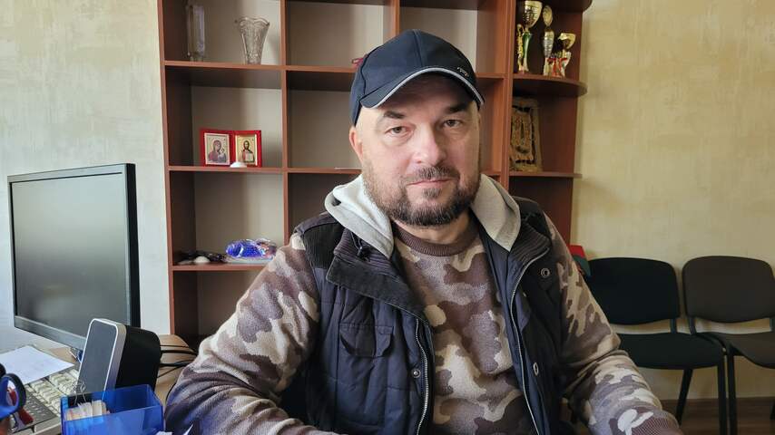 Volodymyr Matsokin, de locoburgemeester van Izium. | Beeld: Hans Jaap MelissenElektriciteit komt nu vooral van generatoren. Wel is de mobiele telefonie, haperend, terug. In het centrum worden vanuit de achterbak van een auto simkaarten van een bekende provider verkocht. Iets verderop staat een lange rij voor een busje, waar vrijwilligers brood en toiletpapier uitdelen.