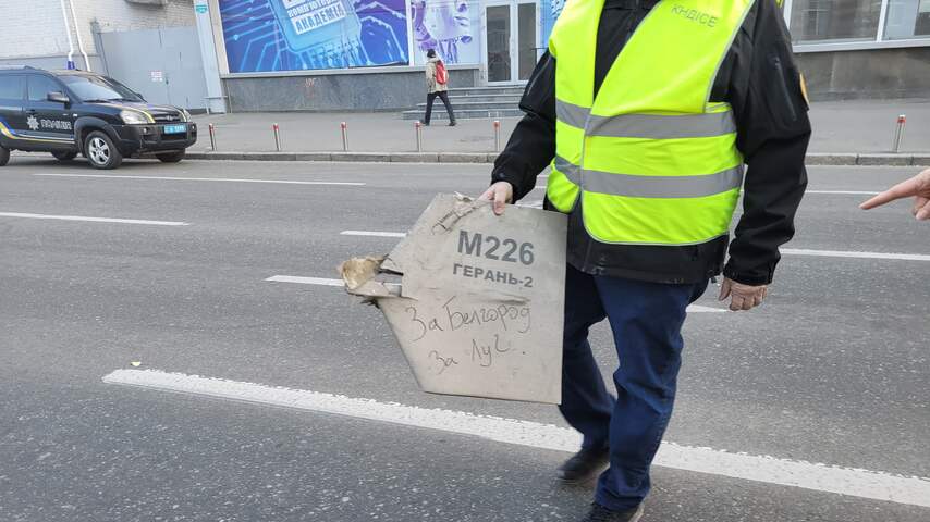 Een man draagt het vermeende staartstuk van de kamikazedrone, die Kyiv trof. | Beeld: Hans Jaap MelissenNiemand weet waarom dit pand is geraakt