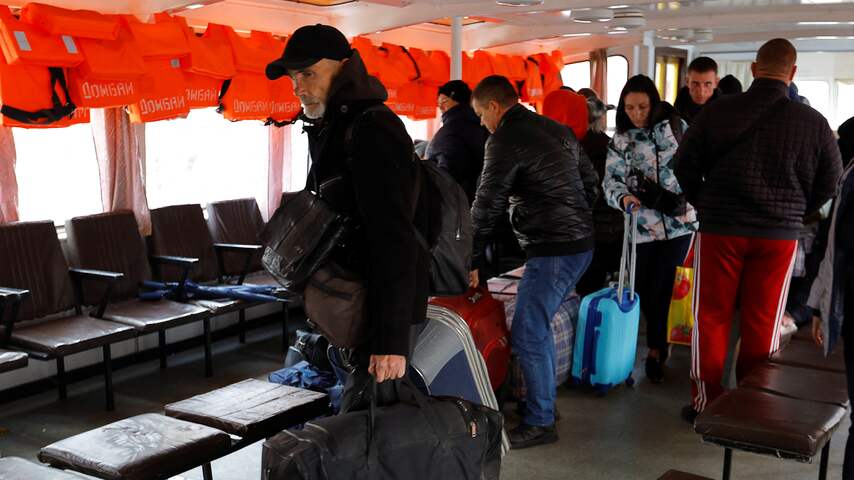 Op veel beelden is te zien hoe burgers Kherson verlaten via bussen, veerboten en te voet: