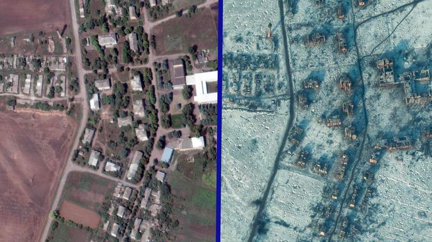 De vernietiging van Soledar is op satellietbeelden te zien. | Beeld: AP/Maxar Technologies