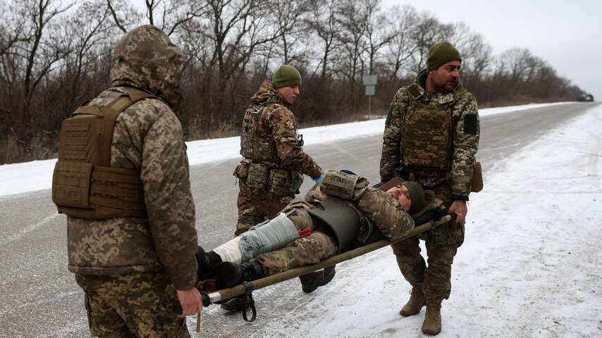 Een gewonde Oekraïense soldaat wordt weggedragen in Soledar. | Beeld: AFP