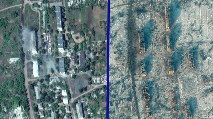 De vernietiging van Soledar is op satellietbeelden te zien. | Beeld: AP/Maxar Technologies