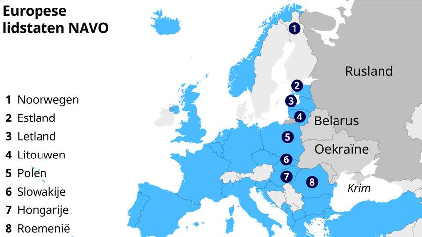 De oostflank van de NAVO. Zweden en Finland zijn niet opgenomen in dit kaartje, omdat ze nog kandidaat-lid zijn. | Beeld: NU.nl/Bart-Jan Dekker