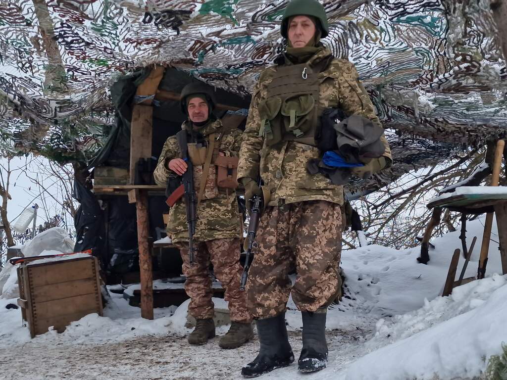 Een deel van de Russische linie die de ring rond Bakhmut probeert te sluiten is hier vlakbij. Continu klinkt er om ons heen artillerievuur. Het is uitgaand richting de Russen, vanuit de velden naast ons. Maar we horen ook de harde klappen van inkomend vuur verderop. De artilleriestukken naast de weg zijn soms bedekt met bruingroene camouflagenetten die beperkt effect hebben in dit besneeuwde landschap. Er zijn hier nog weinig burgers, maar bij veel huizen staan wel militaire voertuigen geparkeerd.