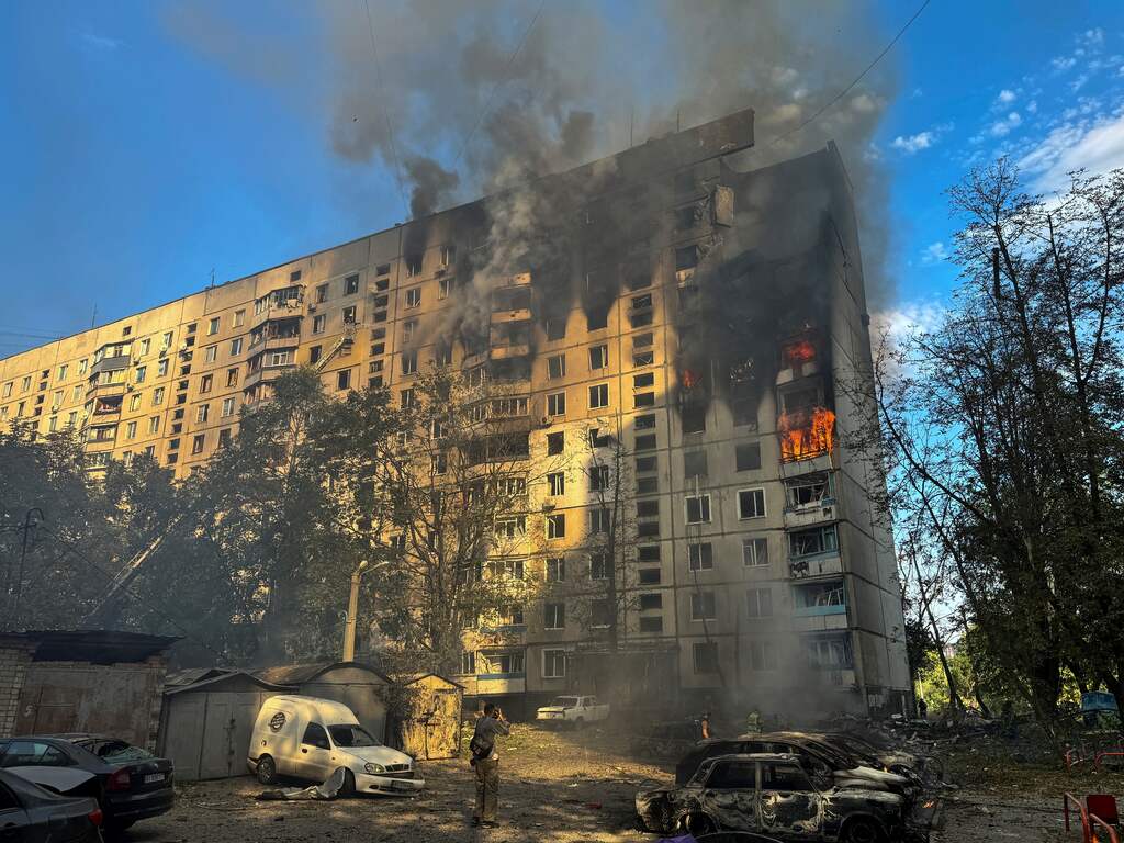 Het flatgebouw in Kharkiv dat werd getroffen is twaalf verdiepingen hoog.