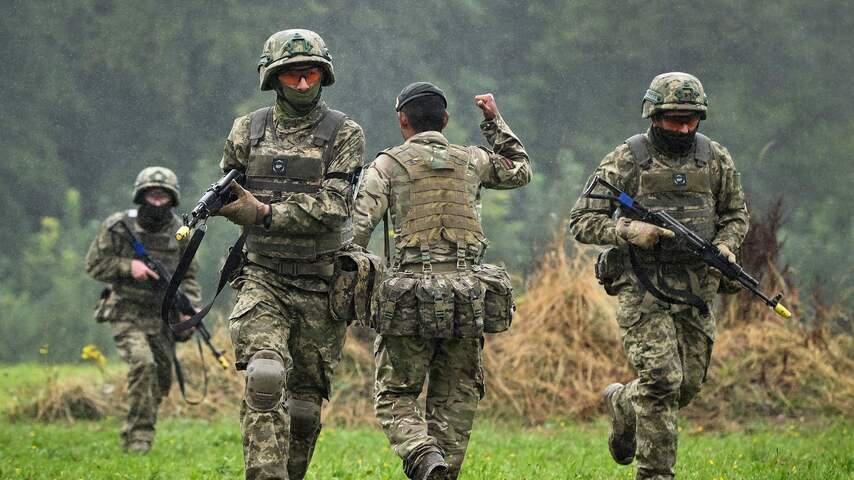 Oekraïense soldaten tijdens een trainingsoefening in het Verenigd Koninkrijk donderdag. De Britten behoren tot de grootste financiers van Oekraïne. Londen benadrukte na de inval in Kursk dat het land Oekraïne blijft steunen.