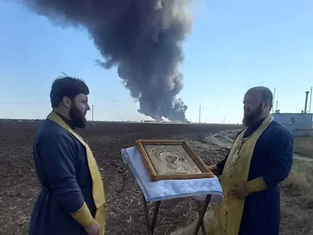 Orthodoxe priesters brengen woensdag een religieuze afbeelding naar een grote brand in een dieseldepot in Proletarsk in de zuidelijke Russische regio Rostov. Ook zegenen ze brandweerlieden en brandweermateriaal. Zo hopen ze te helpen bij de bestrijding van de brand die al sinds zondag woedt. Deze zou zijn ontstaan na een Oekraïense drone-aanval.