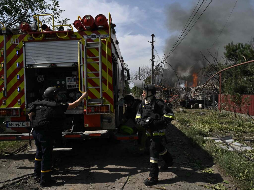 De Oekraïense brandweer is druk bezig met het blussen van een brand na een Russische raketaanval op het dorp Myrnohrad in het Donetsbekken.