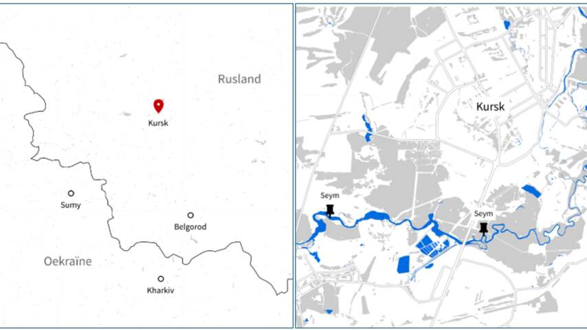 De oorlog speelt aan meerdere fronten. Zie hier het door Oekraïne bezette gebied in Rusland in de regio Kursk. In de stad Kursk heeft Oekraïne drie bruggen verwoest die over de rivier de Seym.