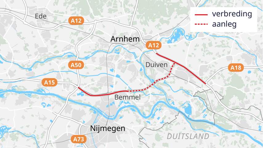 Het doortrekken van de A15 naar de A12 ten oosten van Arnhem moet voor minder files op wegen rondom Arnhem en Nijmegen zorgen. Daarnaast wil Rijkswaterstaat de A15 en de A12 verbreden.