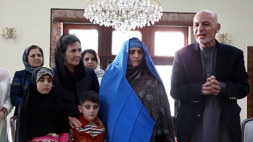 In 2016 hield oud-president Ashraf Ghani (r) een welkomstreceptie voor Sharbat Gula (in blauw) in het presidentieel paleis in Kaboel. | Beeld: EPA