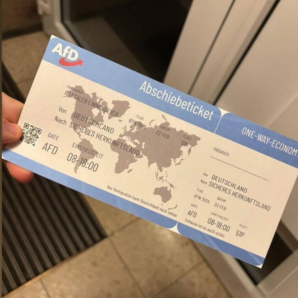 Op de flyers, die eruitzien als vliegtickets, staat onder meer de tekst "Enkele reis. Van: Duitsland - Naar: Veilig land van herkomst". Bovendien is de passagier volgens de flyer een "illegale immigrant". De vertrekdatum is 23 februari, de dag van de Duitse parlementsverkiezingen.