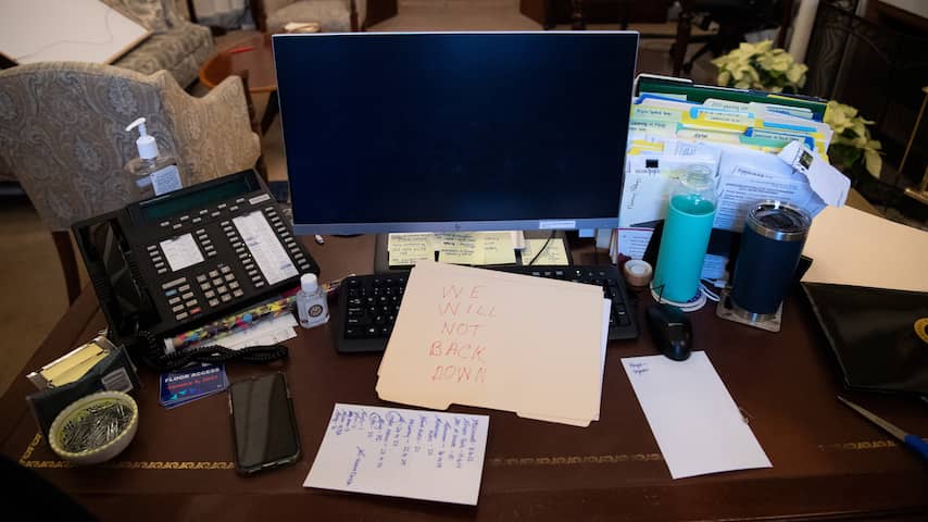 Een van de relschoppers heeft een notitie achtergelaten op het bureau van Nancy Pelosi, de Democratische voorzitter van het Amerikaanse Huis van Afgevaardigden. 'We zullen niet terugdeinzen', zo valt er te lezen. | Beeld: ANP
