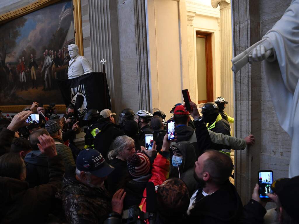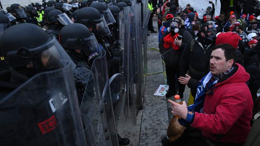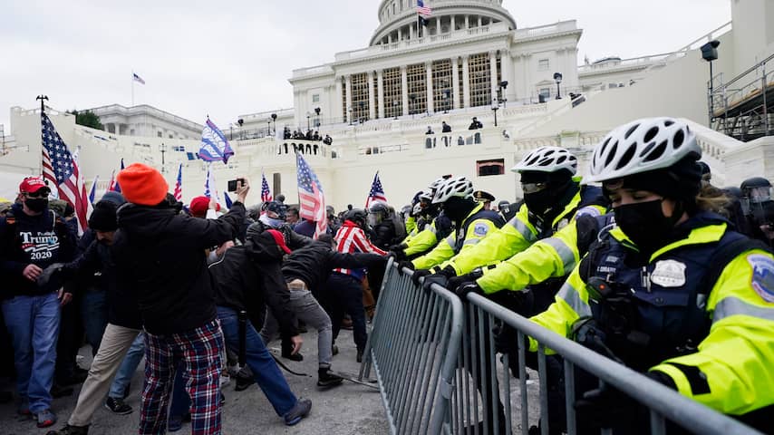 Rond 20.00 uur (Nederlandse tijd), een uur na de start van de zitting, probeerden de Trump-aanhangers het gebouw te bestormen. Hoewel de aanwezige politie verwoede pogingen deed de bestorming te stoppen, wisten de demonstranten toch door de barricades te breken. | Beeld: ANP