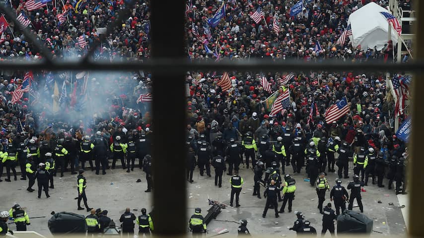 Buiten het Capitool trad de politie op tegen de Trump-aanhangers en zette onder meer traangas in. | Beeld: ANP