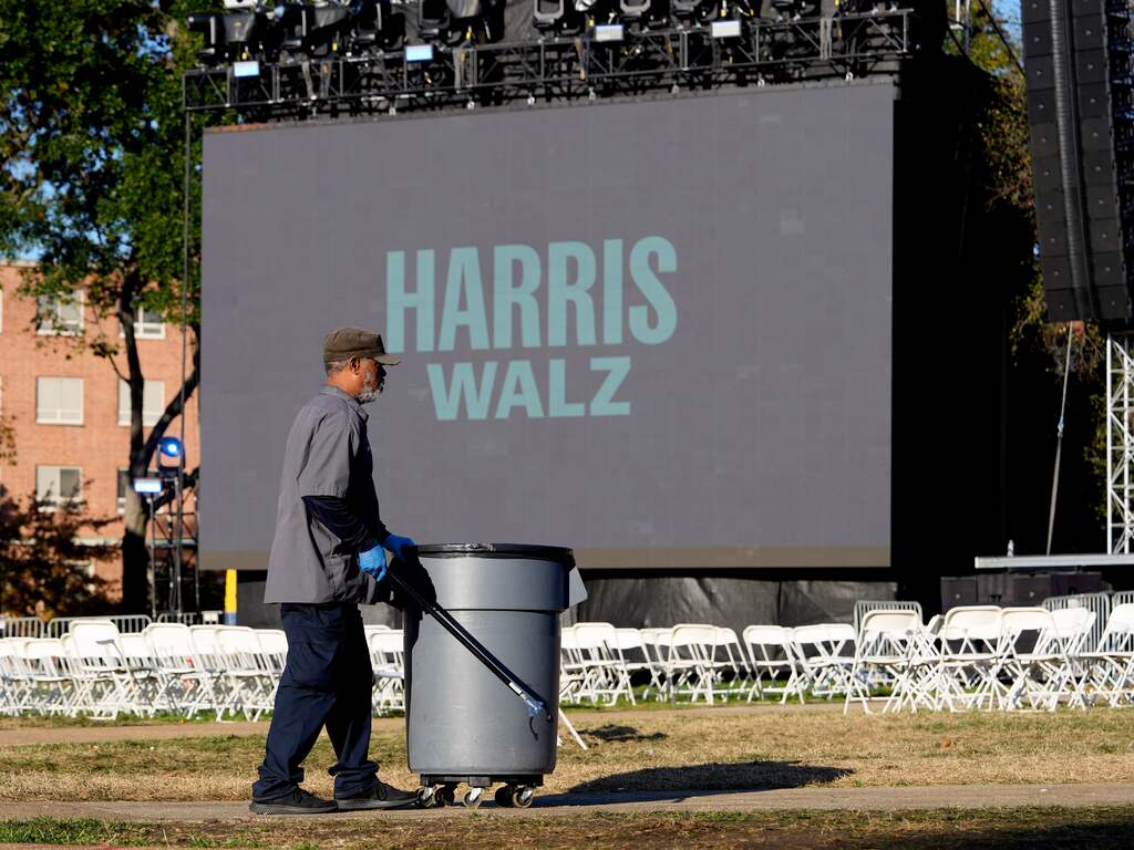 Een schoonmaker ruimt vanochtend het terrein van de Howard University op, waar de Democraten gisteren een grote verkiezingsbijeenkomst organiseerden. Vanavond zal Harris op dezelfde plek met een toespraak voor het eerst reageren op haar nederlaag.