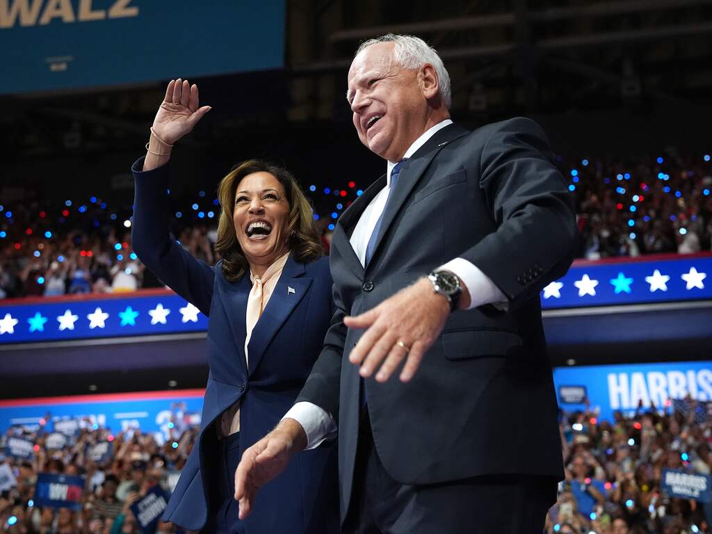 Harris' running mate Tim Walz laat zich zien! Hij bedankt de aanwezigen. Harris zal waarschijnlijk snel volgen.