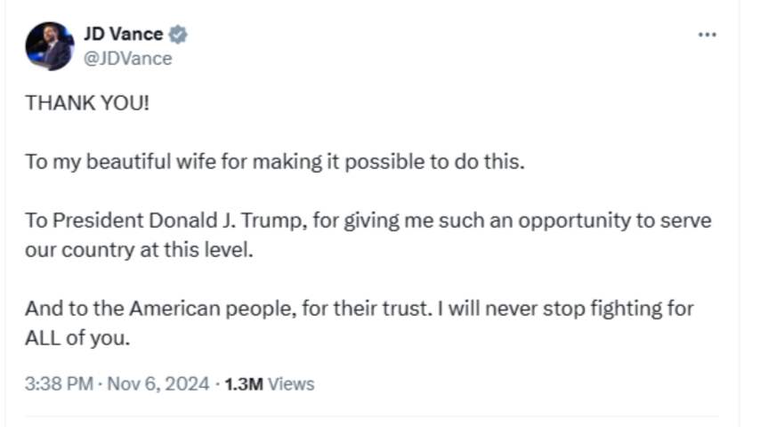 De verkozen vice-president JD Vance bedankt op X zijn vrouw, Donald Trump en zijn kiezers voor de steun tijdens de verkiezingscampagne, waarin hij running mate van Trump was.