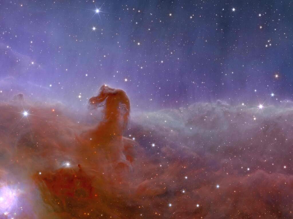 De Paardenkop is een grote gas- en stofwolk waarin sterren worden geboren. Hij is relatief dichtbij: slechts dertienhonderd lichtjaar van de aarde vandaan. Veel telescopen hebben hem al in beeld gebracht, maar nog niet zo uitgebreid als Euclid. | Beeld: ESA/Euclid/Euclid Consortium/NASA