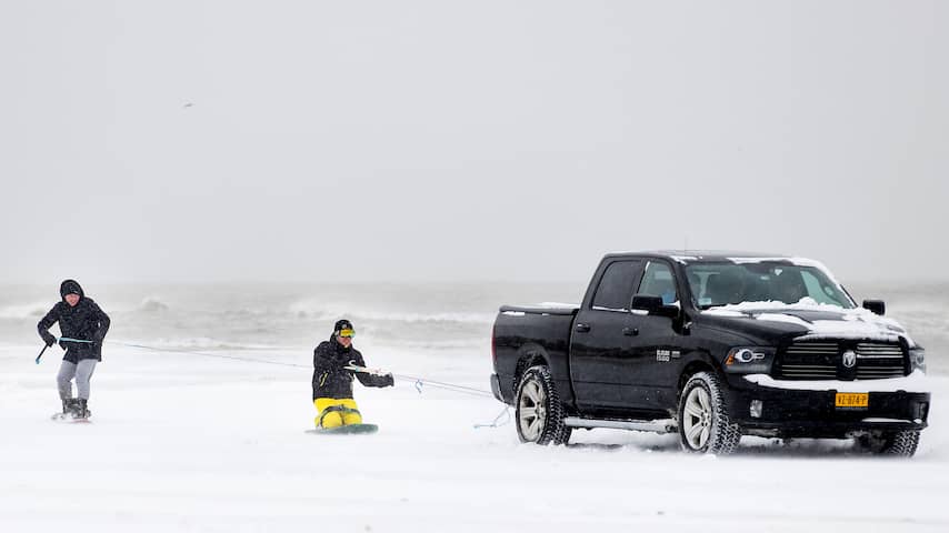 Twee jongens snowboarden achter een auto op het strand van Egmond. | Beeld: ANP